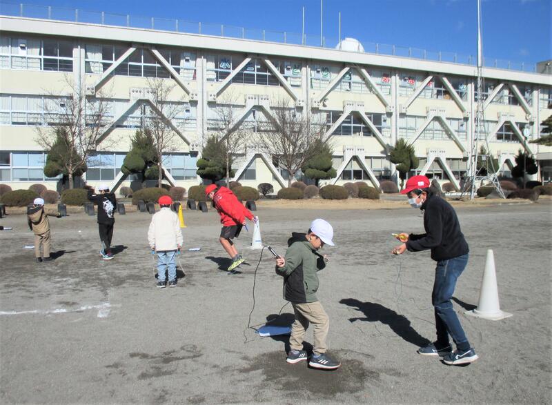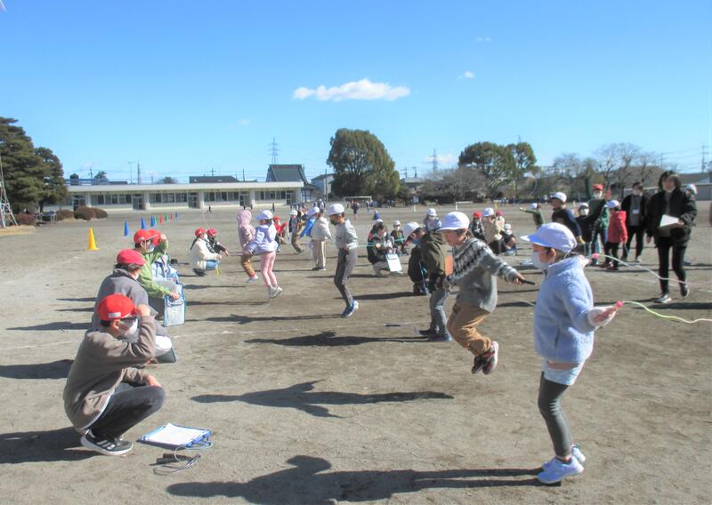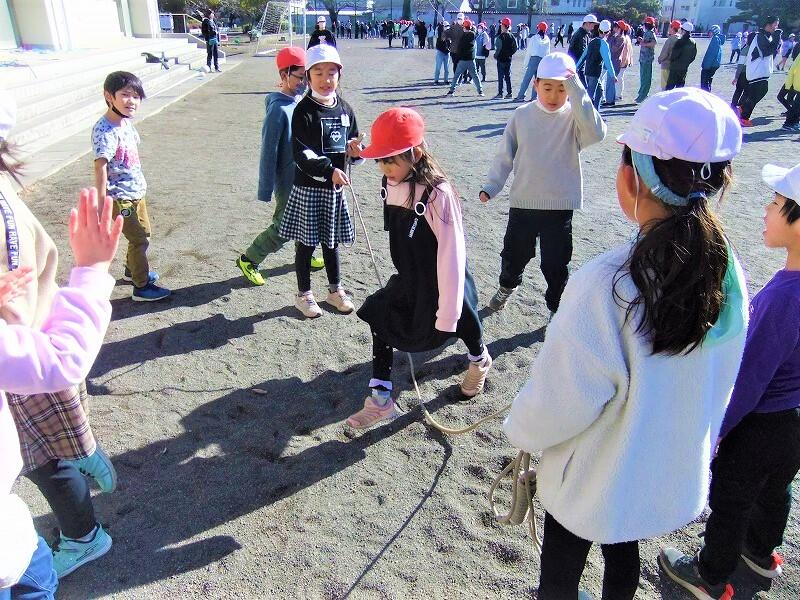 最近、昼休みや業間休みに、大縄跳びの練習をしているクラスや、縄跳びの技に挑戦している子どもたちの姿が多く見られます。今日は晴天ながら風が強く、外は寒い日になりましたが、子どもたちは元気に縄跳びに挑戦していました。