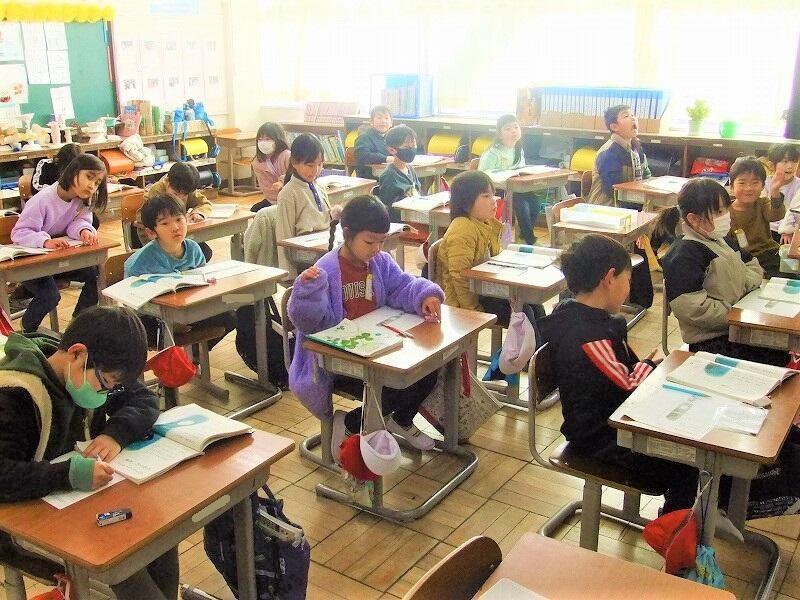 国語の「たぬきの糸車」の授業です。罠から助けてもらったいたずらたぬきが、恩返しをする話です。今日の授業では、たぬきやおばあさんがどんな気持ちだったのかを考えています。