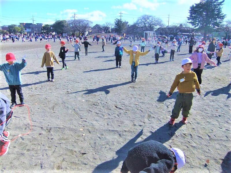 最近、昼休みや業間休みに、大縄跳びの練習をしているクラスや、縄跳びの技に挑戦している子どもたちの姿が多く見られます。今日は晴天ながら風が強く、外は寒い日になりましたが、子どもたちは元気に縄跳びに挑戦していました。