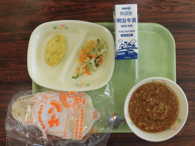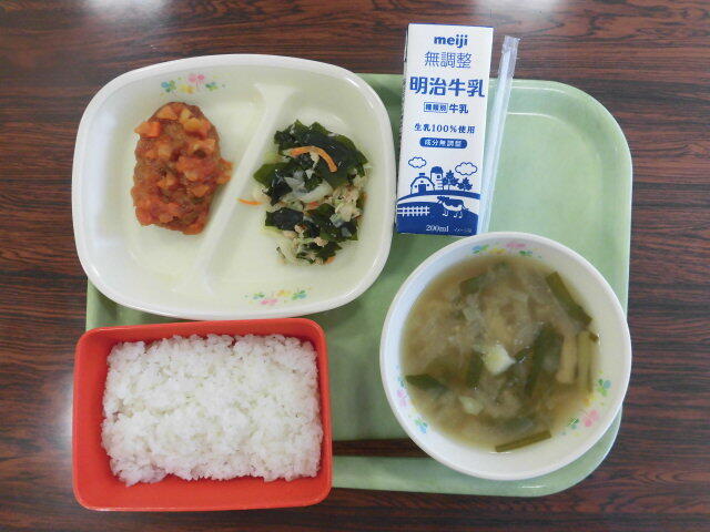 給食のハンバーグは、豚肉と鶏肉を使っています。今日はトマトソースにしました。
