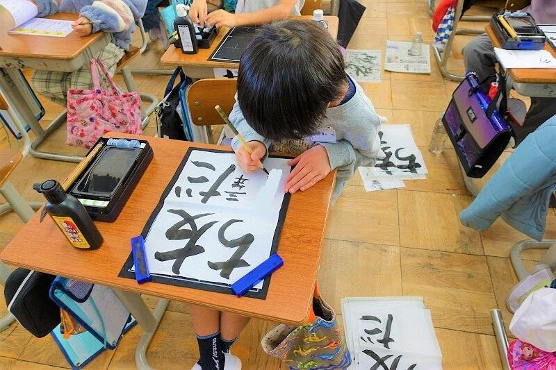 子どもたちは、半紙を前に真剣に作品を仕上げていました。