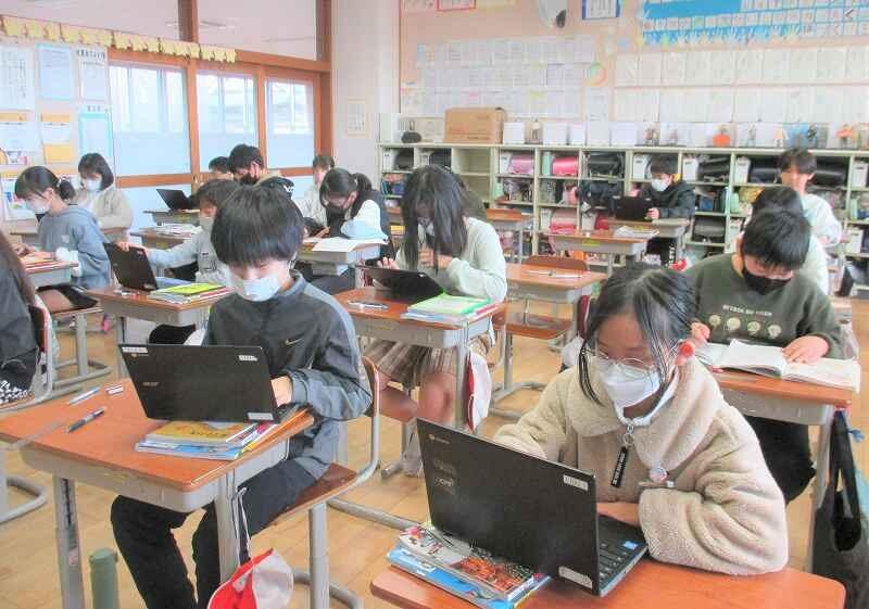 総合的な学習の時間の「自分の将来について語ろう」の授業です。自分の将来の仕事について考えます。適性テストをして、自分に向いていると紹介された仕事について調べ、それを友達に紹介するスライドを作っています。