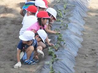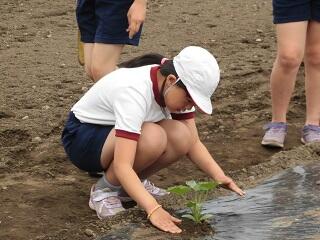 環境サポート隊の方々に教わりながら、5月16日(木)には、5年生がカボチャの苗を植えました。また、5月30日(木)に、6年生が大豆の種まきを行い、昨日と今日の2日間にわたり4年生がさつまいもの苗を植えました。