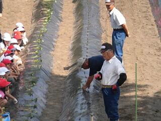 朝から強い日差しが差し込みましたが、そんな中、今日は1年生の児童がさつまいもの苗を植えました。環境サポート隊の3名の方々に教わりながら活動を進めました。