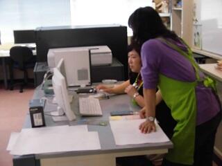 パソコンを使い、資料画像を印刷し、パウチをかけます。