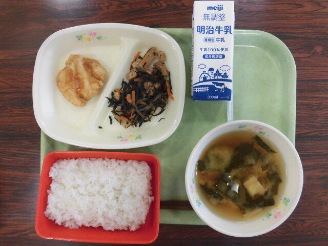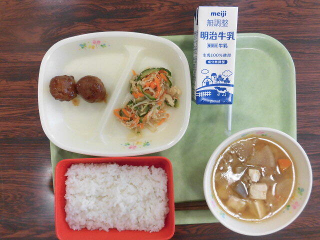 今日の給食には、いか天どんや、ごぼう汁のごぼうや野菜、カムカム海藻サラダの切り干し大根など、かみごたえのある食材をとりいれています。ひと口20回から30回、よくかんで食べましょう。