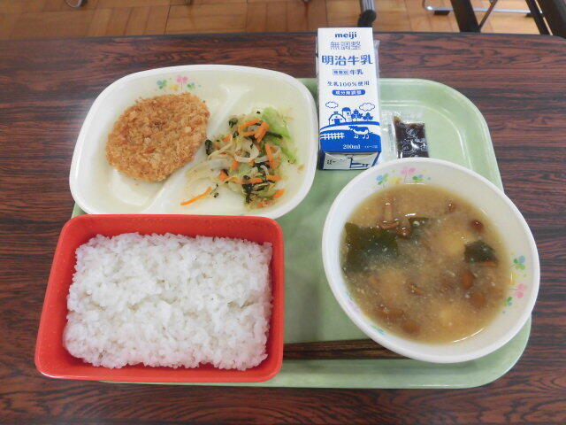 豆腐は、今から1200年ほど前に中国のお坊さんが作ったと言われています。日本には奈良時代に伝わり、現在まで食べ続けられています。今日は、豆腐とわかめのみそ汁にしました。