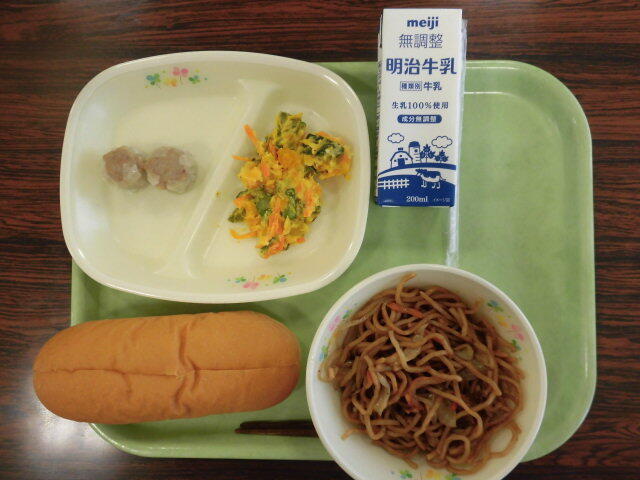 給食の焼きそばは、豚肉、いか、キャベツ、もやし、にんじんを一緒に炒め、焼きそばソースで味付けしています。