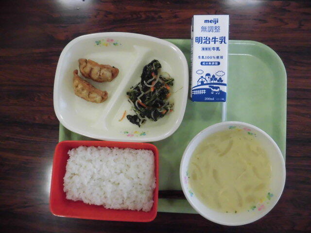 給食のぎょうざは、栃木県産の豚肉とにらを使っています。