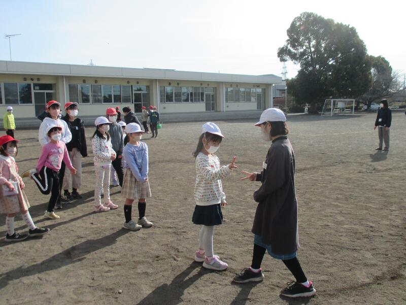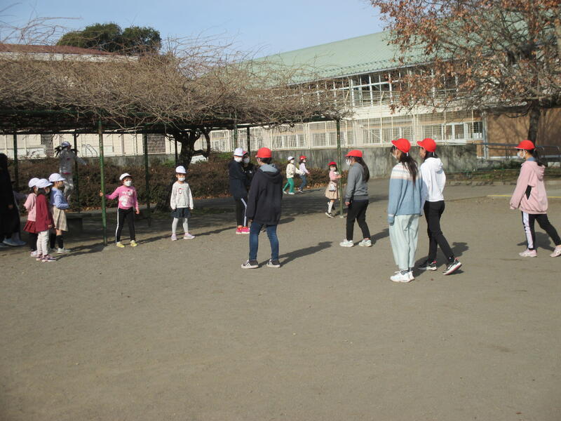 今日の1校時、前回の4組に続いて、6年2組の児童と1年2組の児童が、一緒に集団遊びをして交流しました。「だるまさんがころんだ」や「へびおに」で元気いっぱい遊びました。