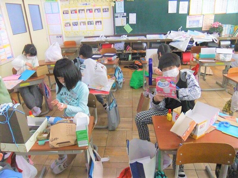 図工の「ともだちハウス」の活動です。空き箱などを使って、「小さなともだち」が住む家を作ります。