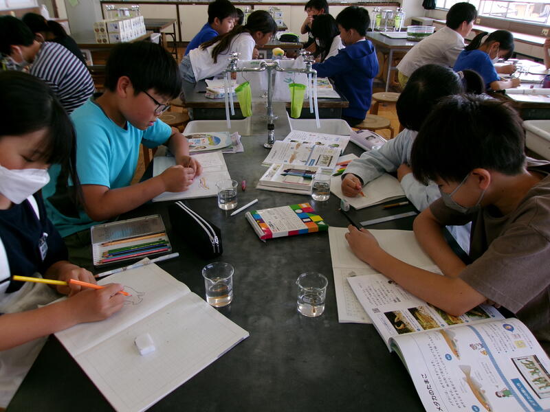 5年生の理科の時間です。メダカの雄と雌を観察して、違いを区別しながらスケッチしています。