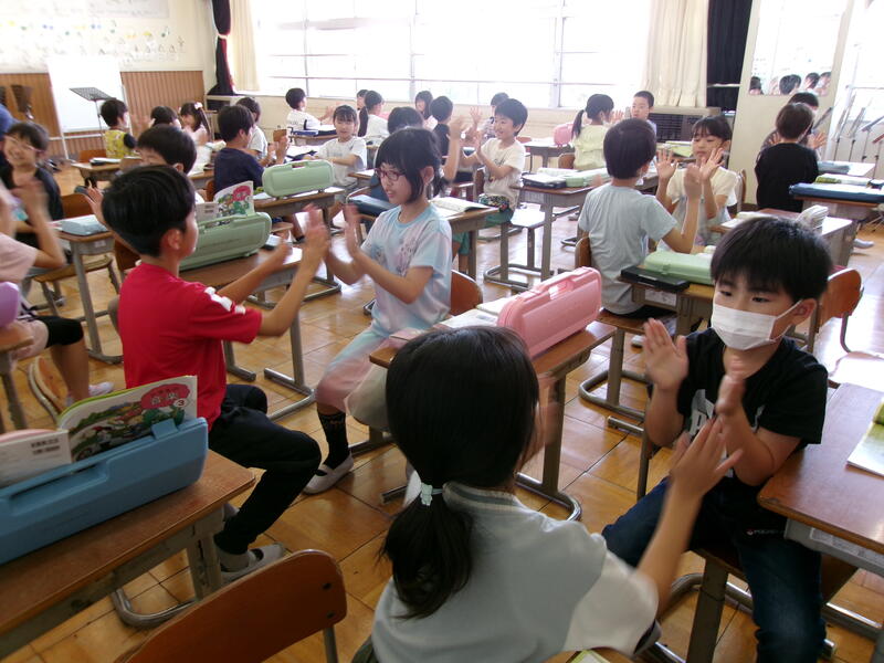 3年生の音楽の授業です。「茶つみ」の歌のリズムに合わせて、楽しく手遊びをしています。