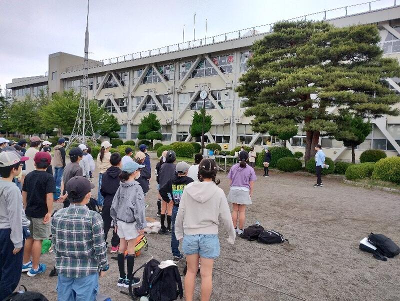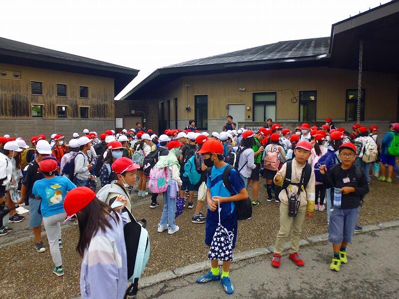 朝6時、子どもたちは一泊二日の荷物を持って校庭に集合し、代表委員の児童の司会で出発式を行いました。