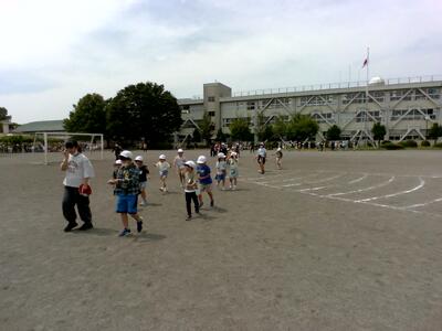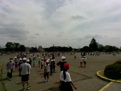 1年生が、体育科で100m走をしました。まず、みんなでしっかり準備運動をしました。