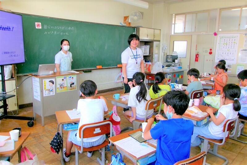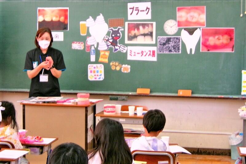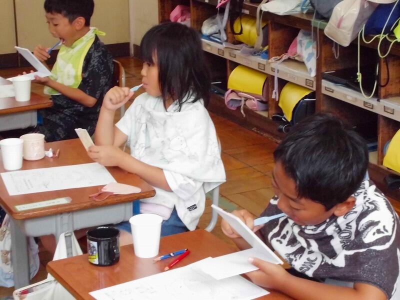 今日は、「歯と口の健康教室」があり、1年生が、歯科衛生士さんから正しい歯磨きの仕方を教えていただきました。