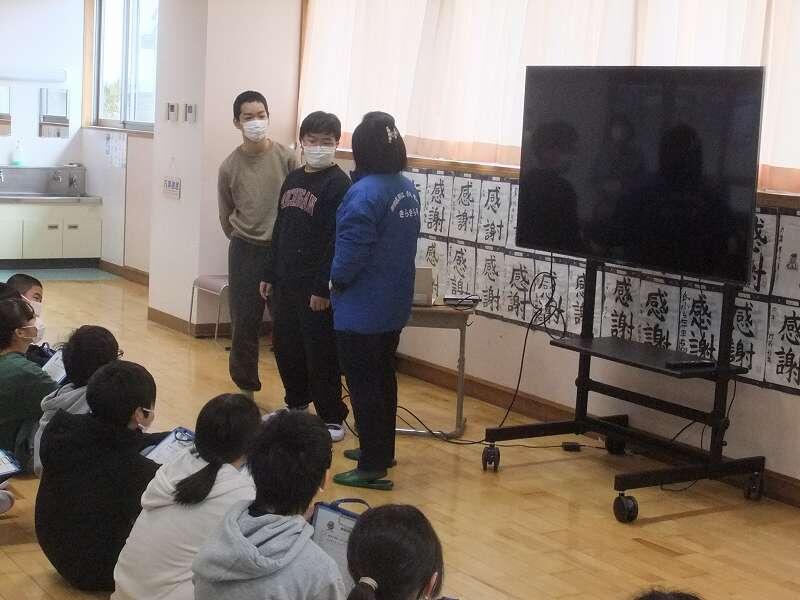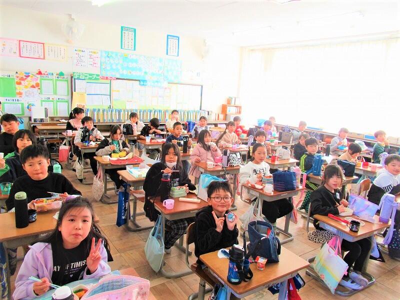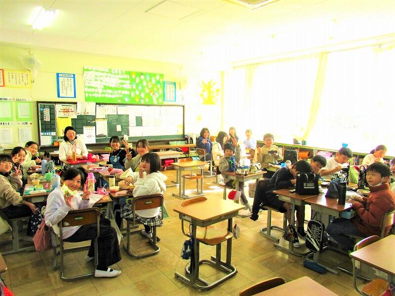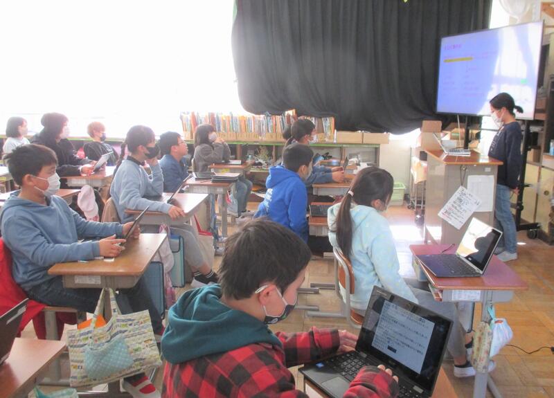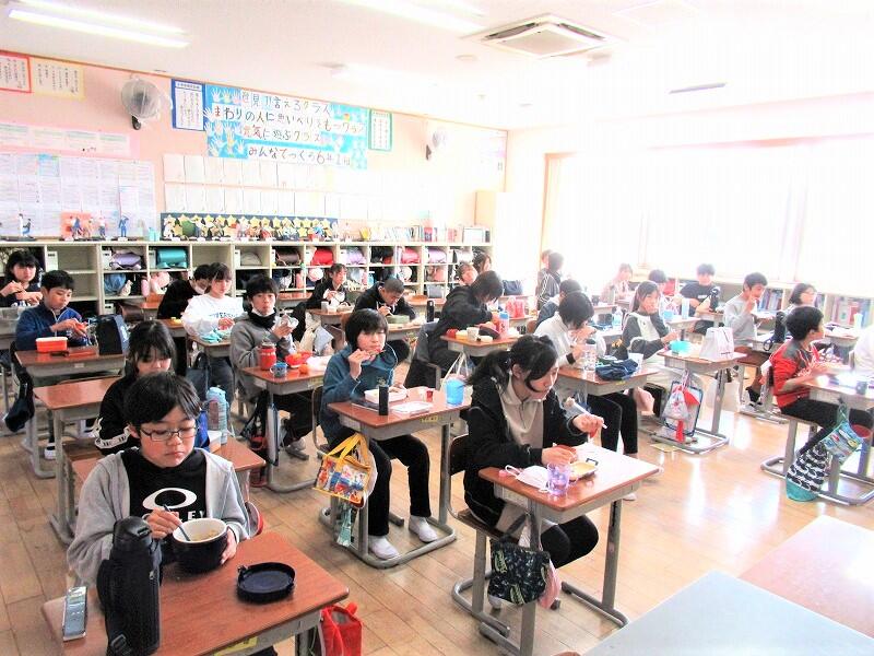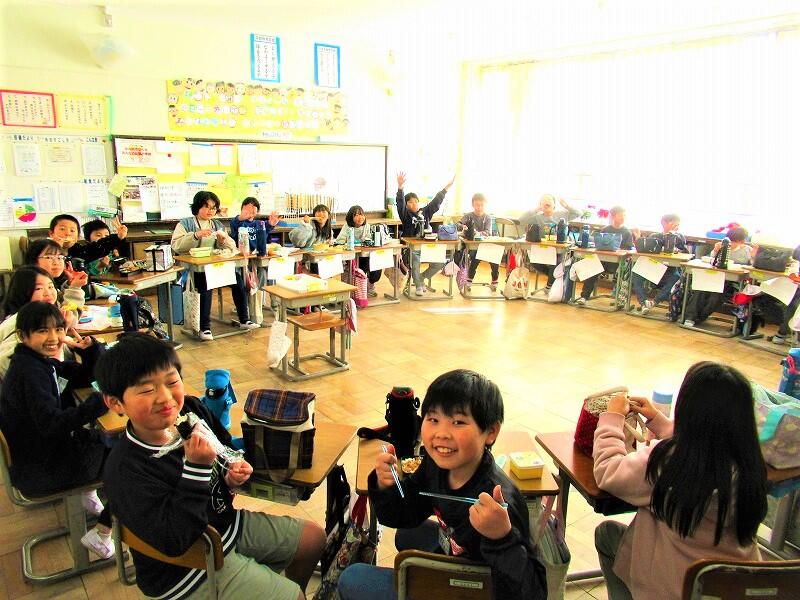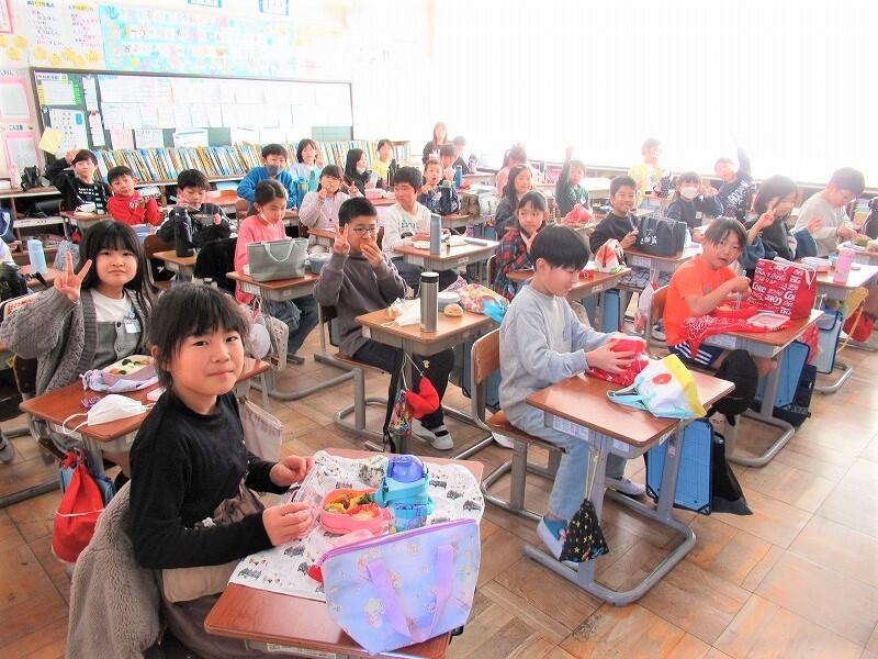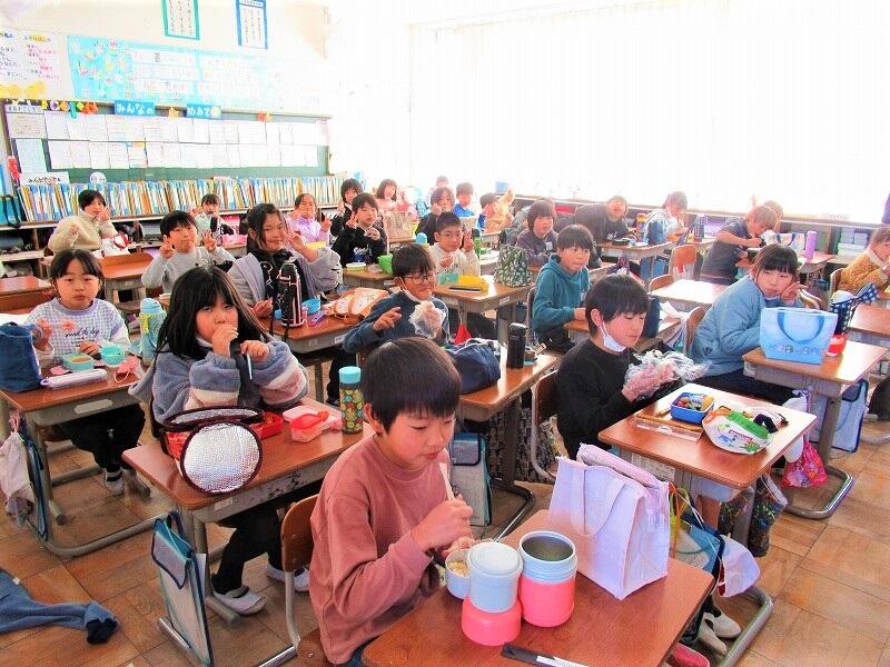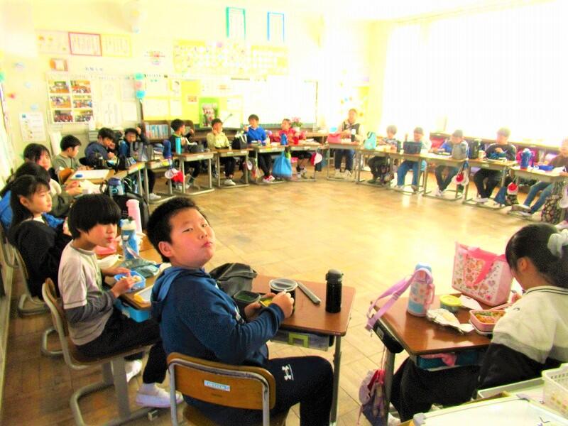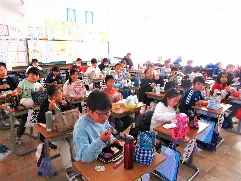 給食の時間に、発表会があることを校内放送で連絡し、希望する児童は自由に見学することができました。