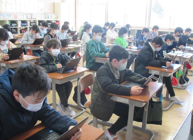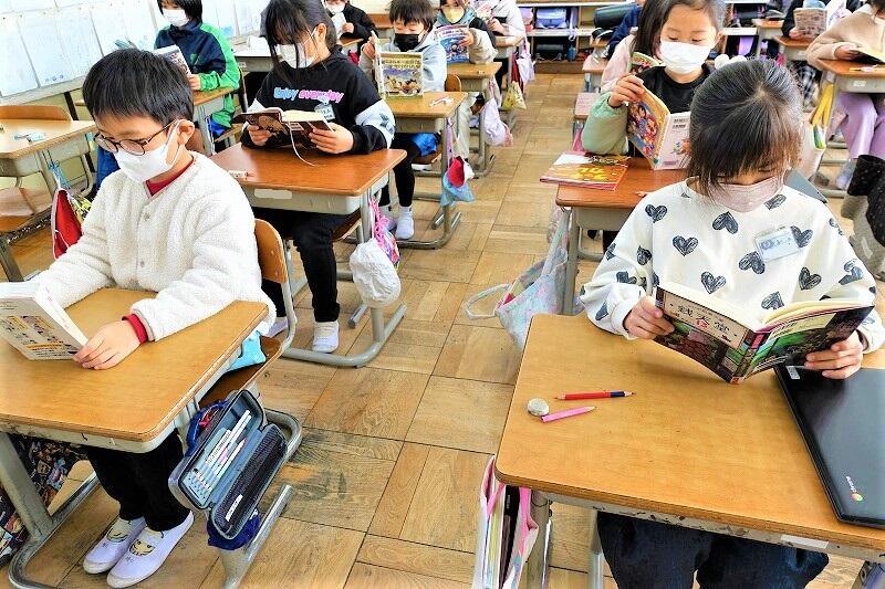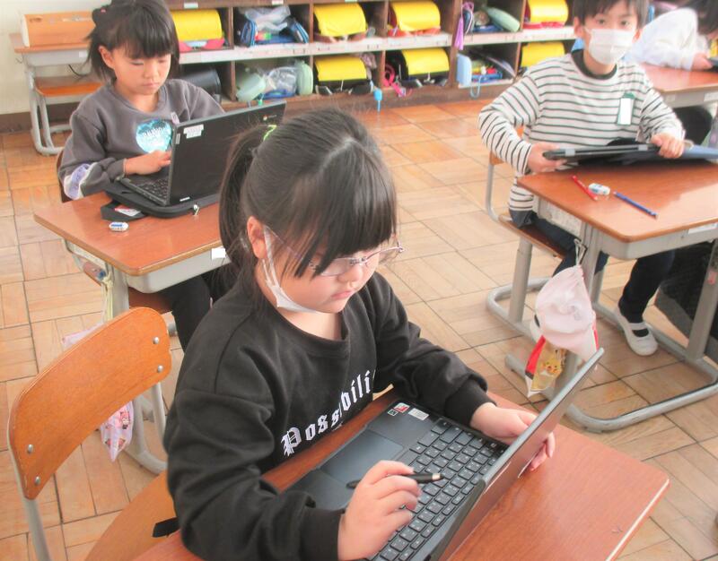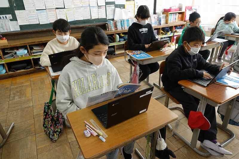 国語の時間です。担任が出張のため、プリント学習をし、終わった子はeライブラリをやったり、読書をしたりしています。