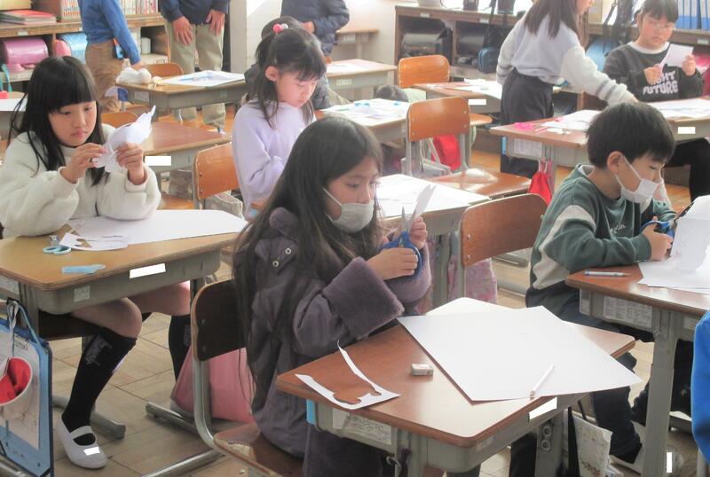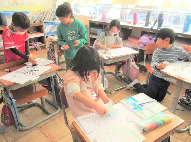 図画工作の授業の様子です。「たのしくうつして」の学習で、画用紙を切って紙版画のための型紙を作っています。子どもたちは、工夫して様々な形の型紙を作りました。