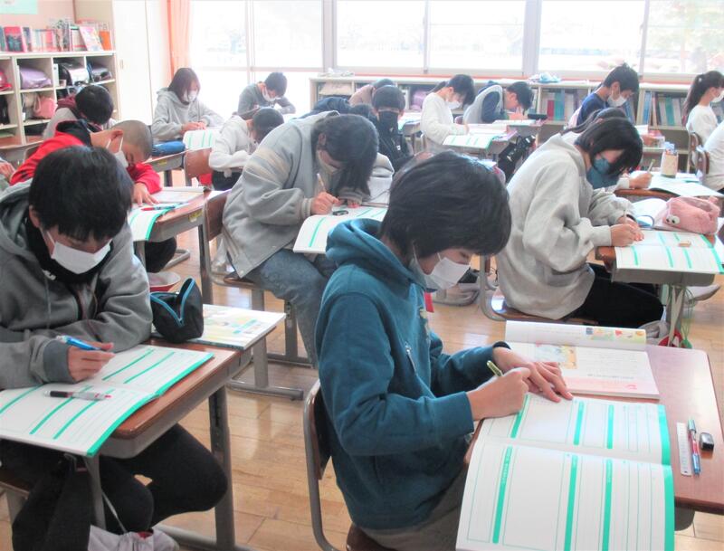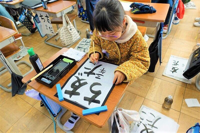 書写の授業です。書き初めとして、「友だち」という字を書いています。ひらがなと漢字のバランス、おれと曲がり、右払いと左払いなど、これまで学習したことを活用して書く課題です。