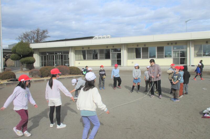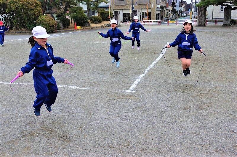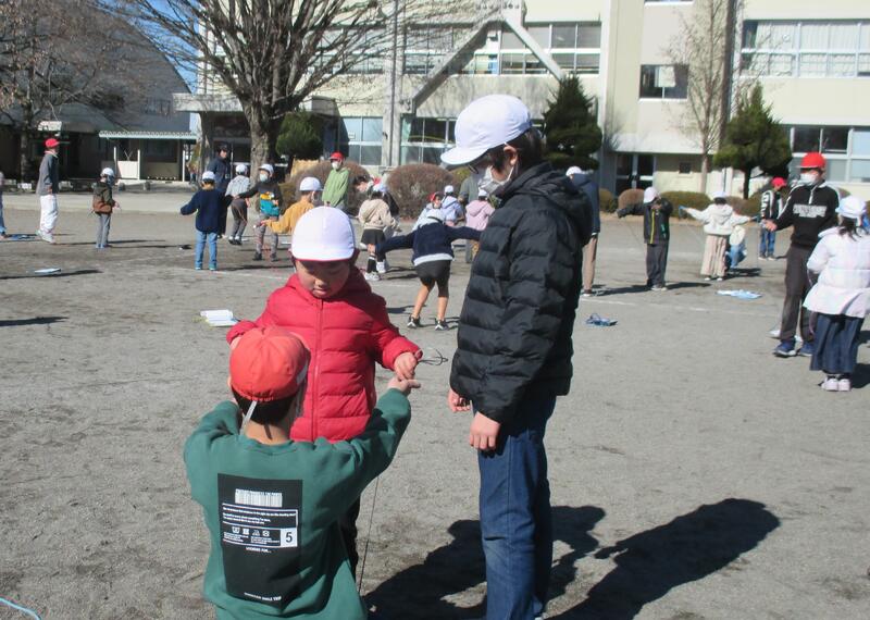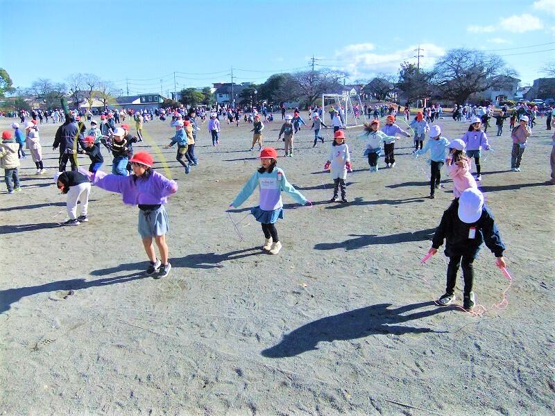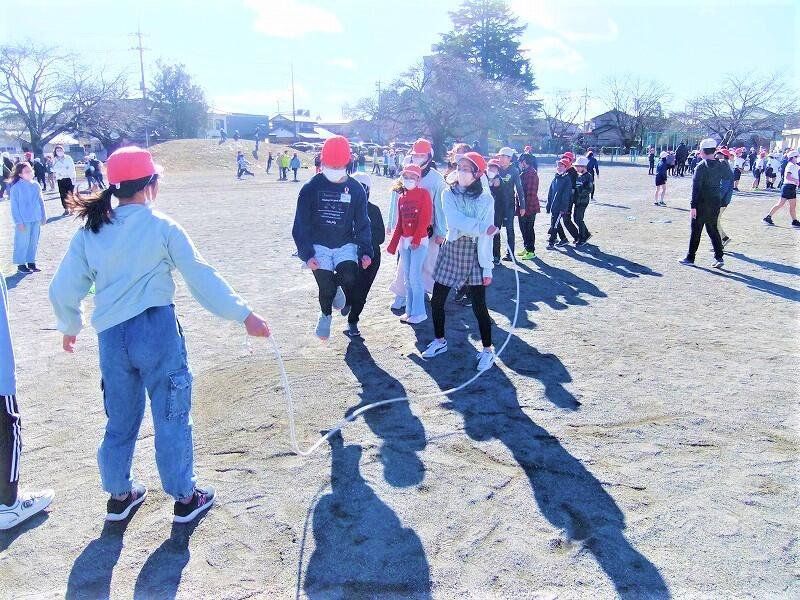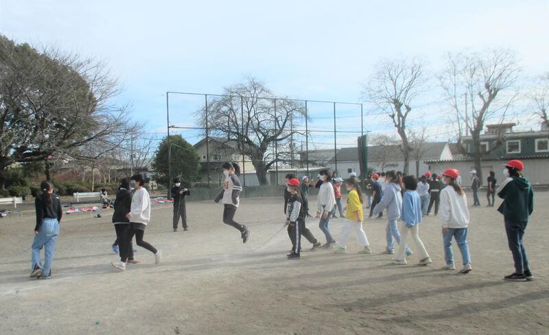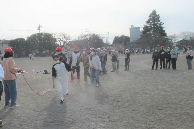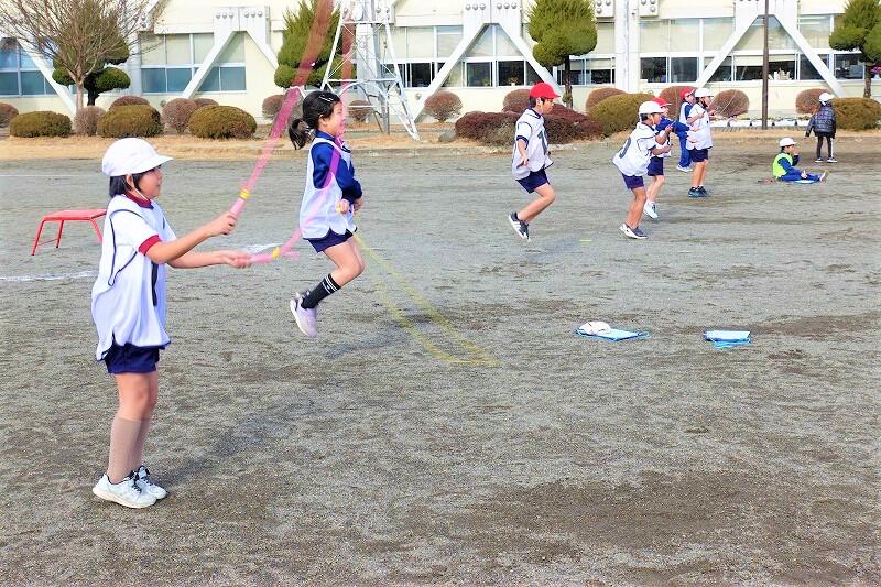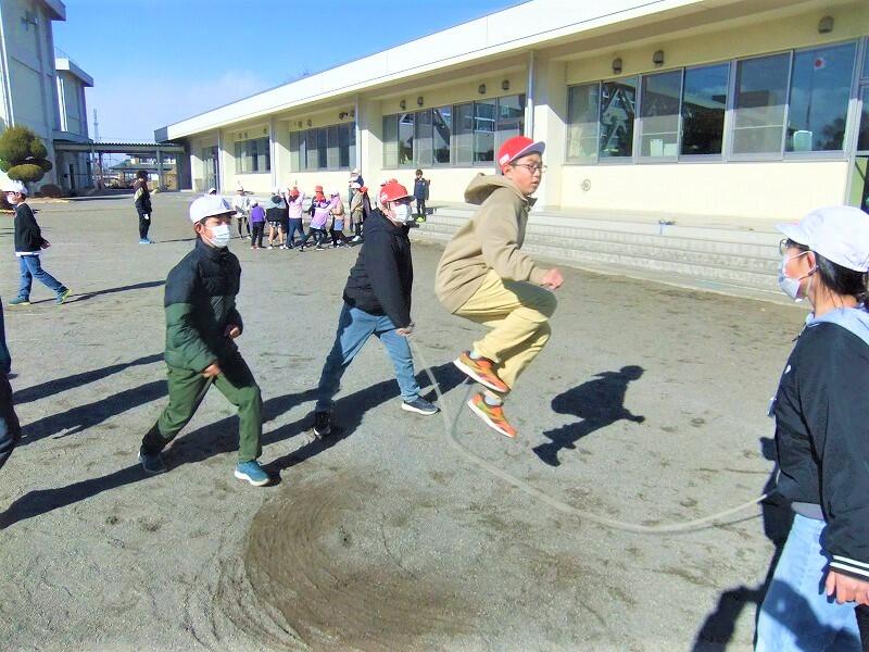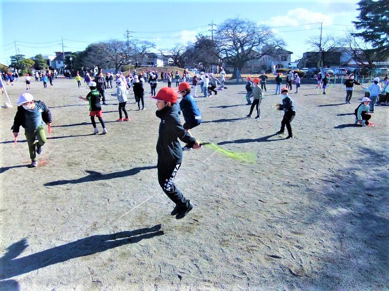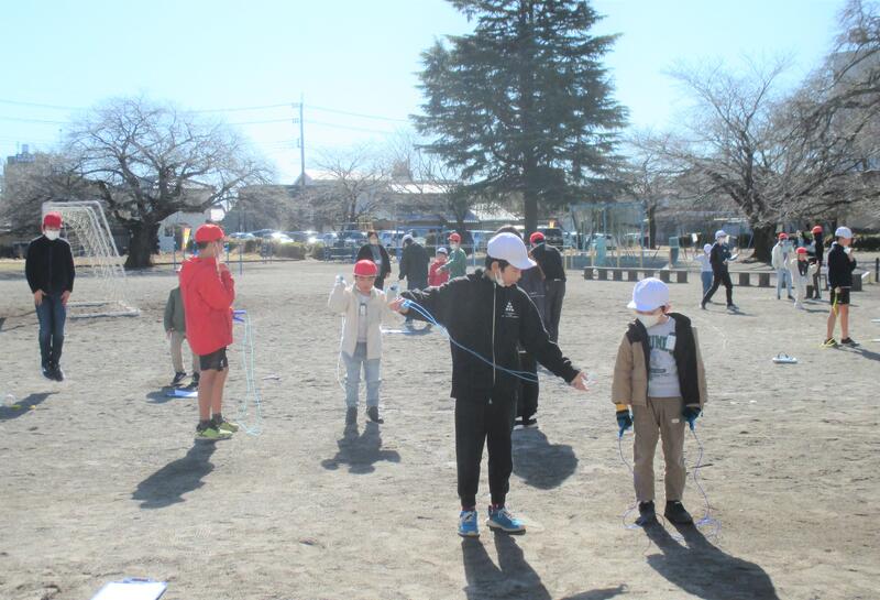 最近、昼休みや業間休みに、大縄跳びの練習をしているクラスや、縄跳びの技に挑戦している子どもたちの姿が多く見られます。今日は晴天ながら風が強く、外は寒い日になりましたが、子どもたちは元気に縄跳びに挑戦していました。