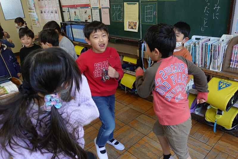 音楽の授業です。「もりのくまさん」の学習で、音楽に合わせて体を動かしています。子どもたちは、友達と一緒に音楽を楽しむことができました。