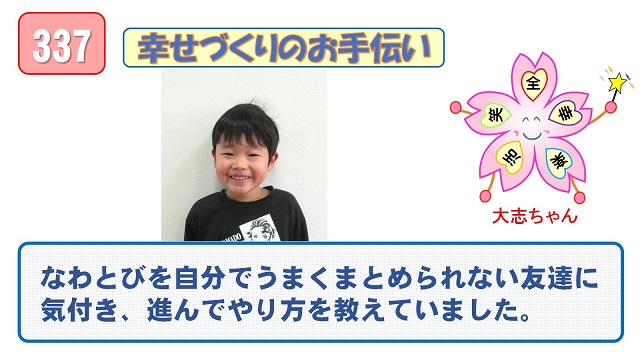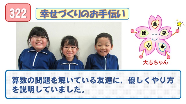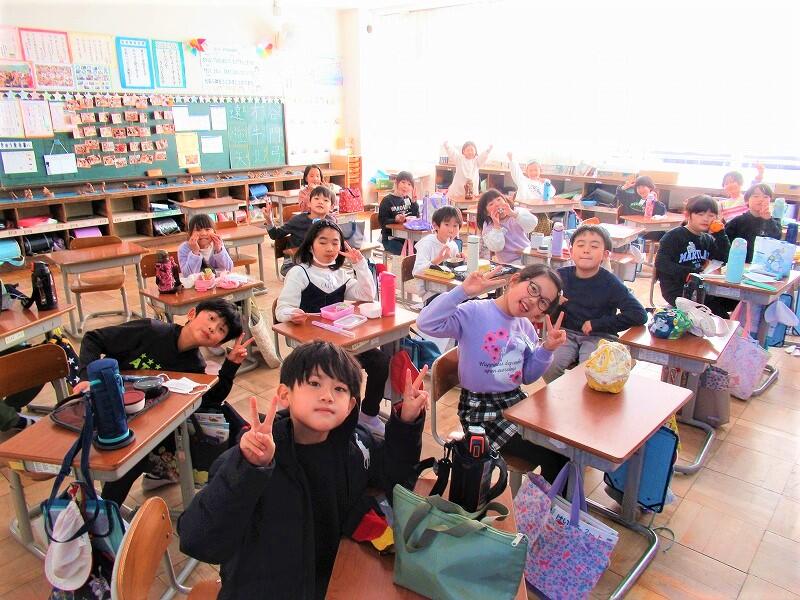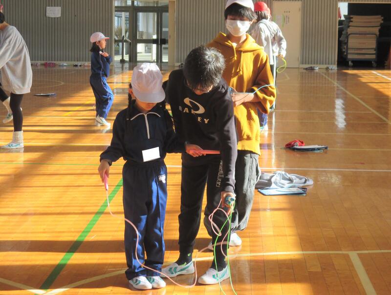 今日は6年3組が総合的な学習の時間の一環で「幸せづくりプロジェクト」として、1年3組に短縄跳びの跳び方を教えてくれました。6年生は、1年生が跳んだ回数を数えたり、「こうやって跳ぶといいよ。」と優しくアドバイスしたりしていました。1年生は、「やった!とべたよ!」とうれしそうにしていました。6年生の皆さん、丁寧に教えてくれてありがとう。