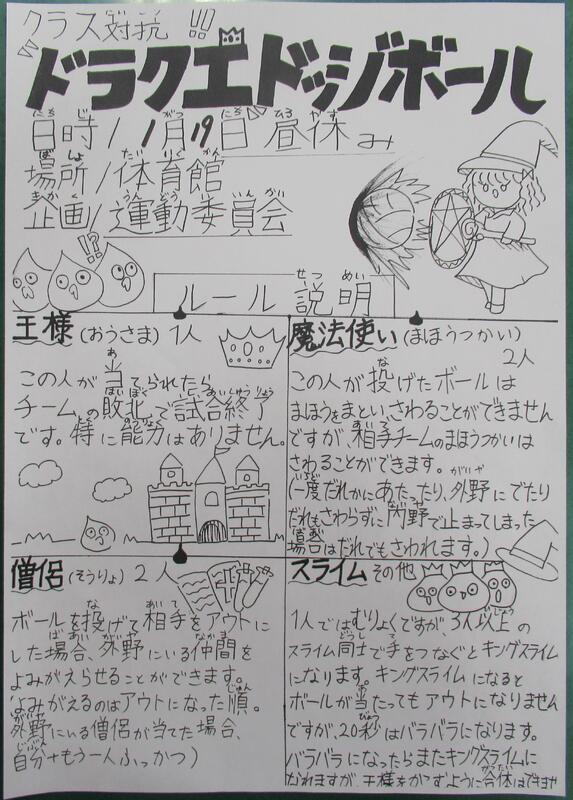 運動委員会が「ドラクエドッジボール大会」を企画し、今日の昼休み、1年生の希望者が集まってドッジボールをしました。運動委員がルールを説明し、1年生はルールを守って楽しくドッジボールをすることができました。