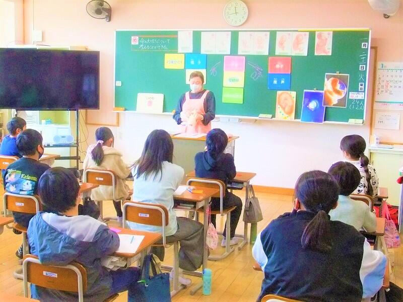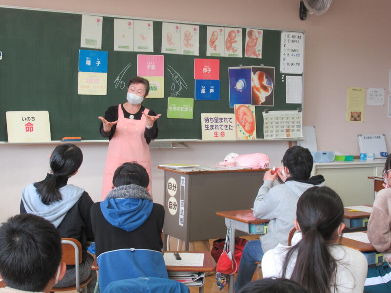 お母さんの胎内の受精卵が、時間をかけて少しずつ胎児として成長する様子を写真で見たり、心音を聞いたり、命の誕生についての話を聞いたりして、命の大切さについてじっくり考えることができました。「生きているだけで100点満点!」「命ある時間、健康な心で生き続けてほしい」という言葉は、子どもたちの心に響いていました。