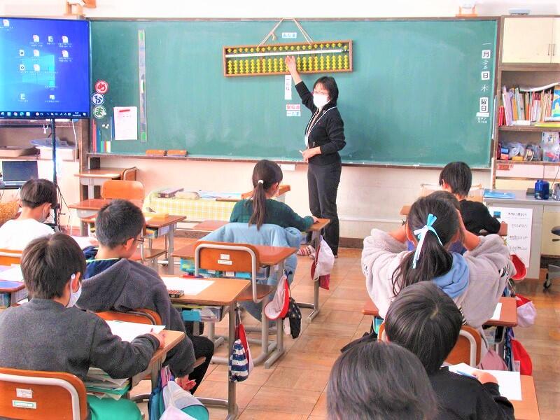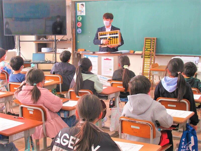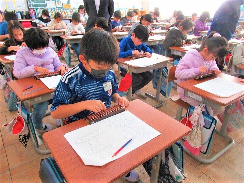 そろばんの各部の名前や、数の表し方、簡単な計算の仕方などを教えていただき、子どもたちは真剣な表情でそろばんの使い方を学んでいました。