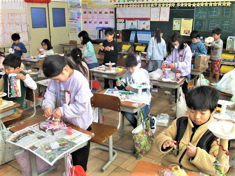 図工の「かみざらコロコロ」の授業です。風の力で転がるおもちゃを作ります。転がったときにきれいに見えるように、飾りを付けたり、絵や模様を描いたりします。