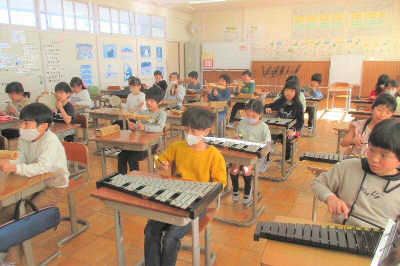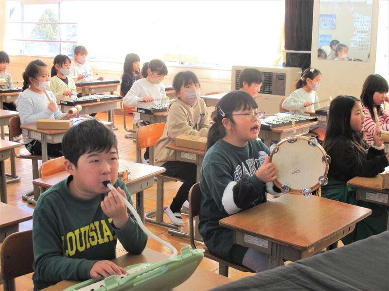 音楽の授業です。「汽車ははしる」の曲に合わせて、自分で好きな楽器を選んで演奏しています。
