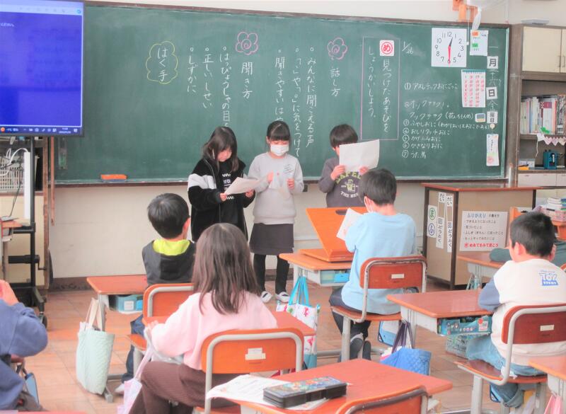 国語の授業です。グループごとに遊びについて調べ、クラスの友達に紹介しています。