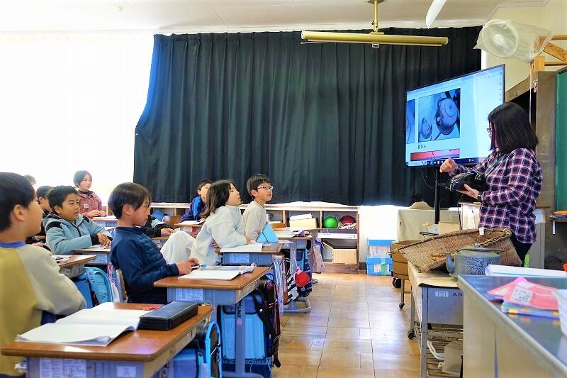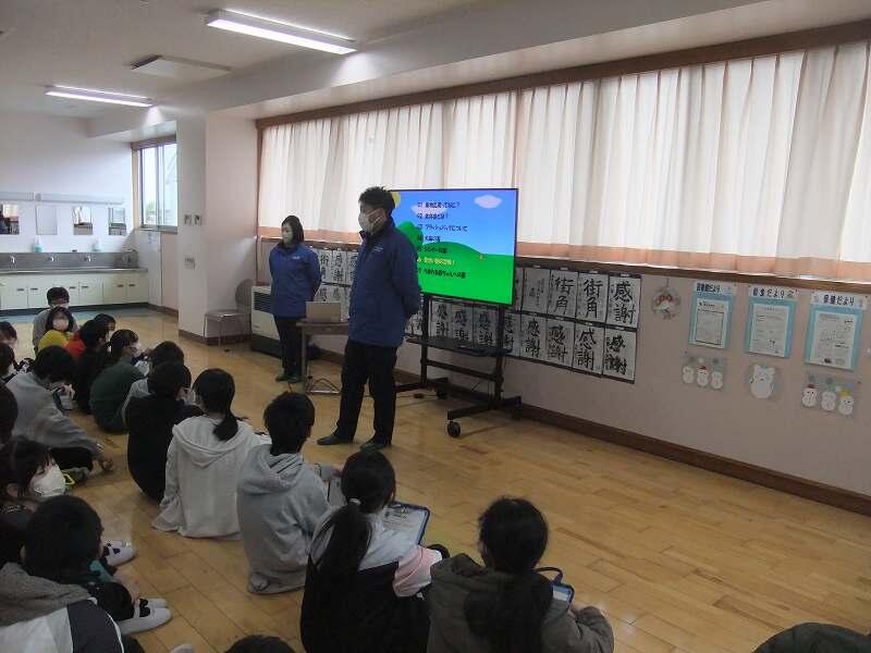 「いちごのはなし」では、苗からいちごが結実し、収穫、出荷までの仕組みを説明していただきました。「田んぼのはたらき」では、水田が持つ農業生産以外の役割や昔と今の農作業の違いを比較しながら水田農業の紹介をしていただきました。クイズも出していただき、農業について楽しく学ぶことができました。