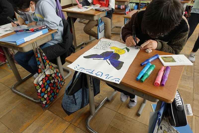 総合的な学習の時間の様子です。今まで学習したことをもとに、鬼怒川の自然や鬼怒川に生息する生き物を守ることを呼びかけるポスターを描いています。子どもたちは、今年度の体験から自然の大切さを知り、ポスターに表現していました。