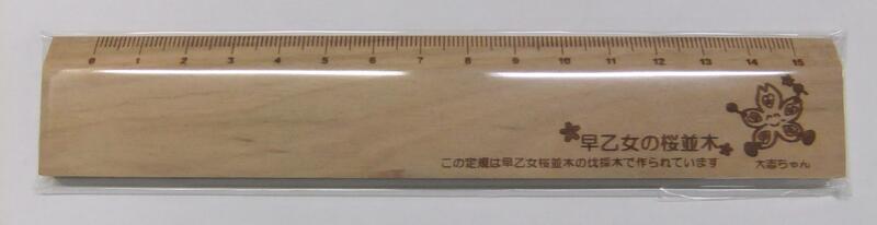 さくら市では、県道拡幅工事に伴って、植樹から約100年が経過する早乙女桜並木を伐採し、その伐採木を記念品として形に残す取組を行っています。長い間、さくら市のシンボルとして住民や観光客を楽しませた早乙女桜並木の歴史等を周知し、市内の児童・生徒に地域への愛着をもっていただくため、伐採木を活用した定規を製作してくださったそうです。製作した定規を児童に配布しますので、ご活用ください。(氏家小の児童には、氏家小キャラクター「大志ちゃん」が入った定規を作ってくださいました。ありがとうございます。)