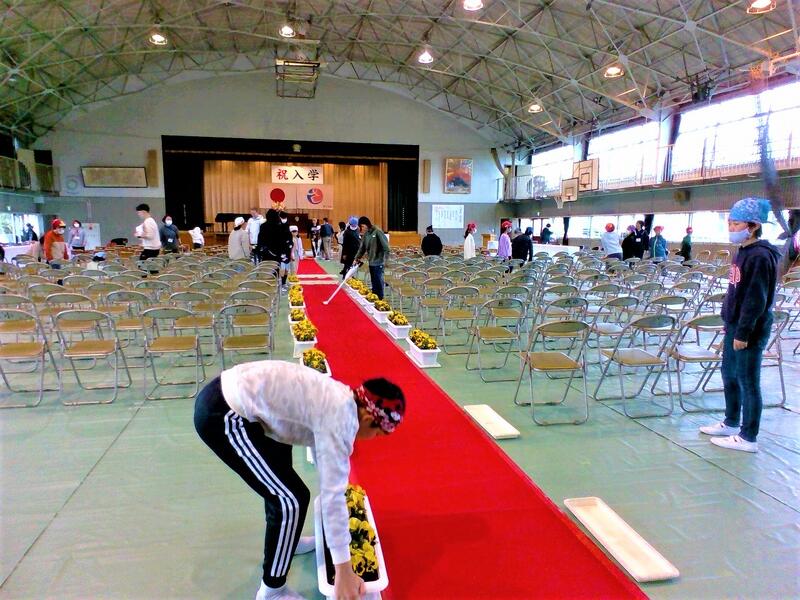 明日の入学式を控え、今日の6校時に、入学式の会場準備を行いました。
