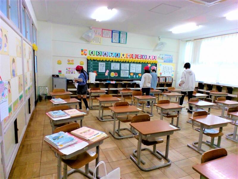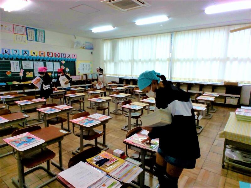 体育館だけでなく、1年教室も、きれいに飾り付けをしたり、色々な配布物を机の上に分けたりします。