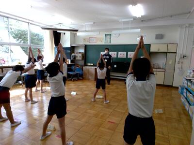 運動器検診です。子どもたちが、担当の先生の動きを真似して簡単な運動をします。その様子を確認して、骨や筋肉などの発達や運動機能を調べる検査です。