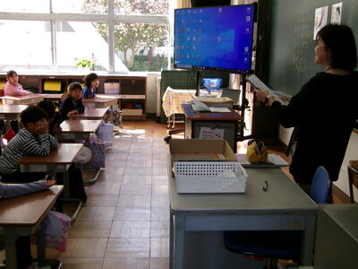 始業式はリモートで行いました。子どもたちは、新しい教室で、真剣に話を聞いていました。
