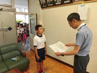 本日、校長室で校外での活躍の表彰式を行いました。学級の仲間も廊下で温かい拍手をしていました。