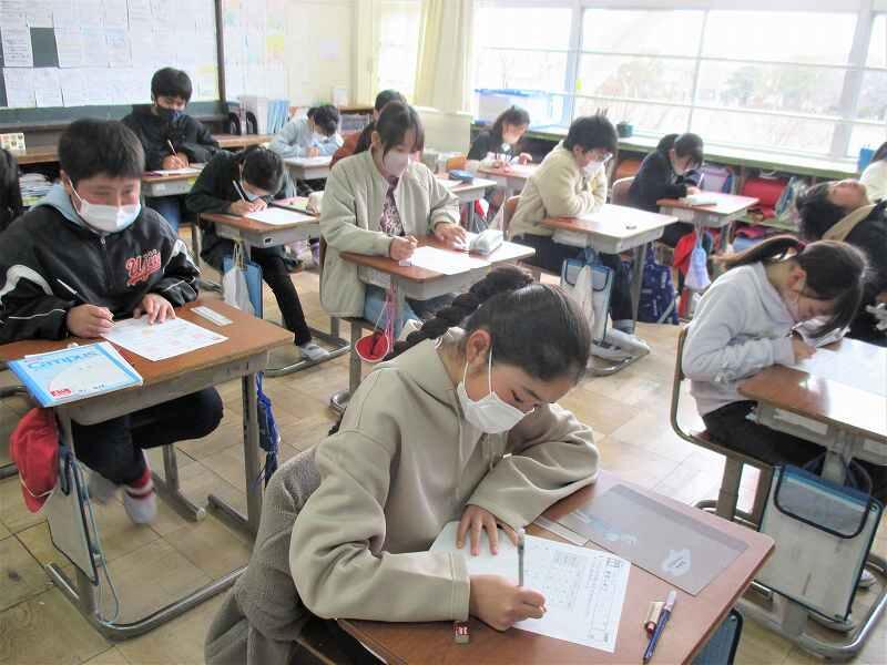 社会科の授業です。中学校に向けて、都道府県や世界の国々などについて、プリントで振り返っています。