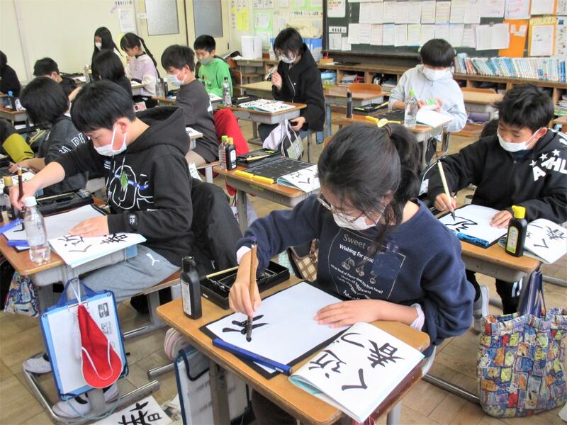 書写の授業です。文字の繋がりや字形に気を付けながら、集中して毛筆に取り組んでいます。