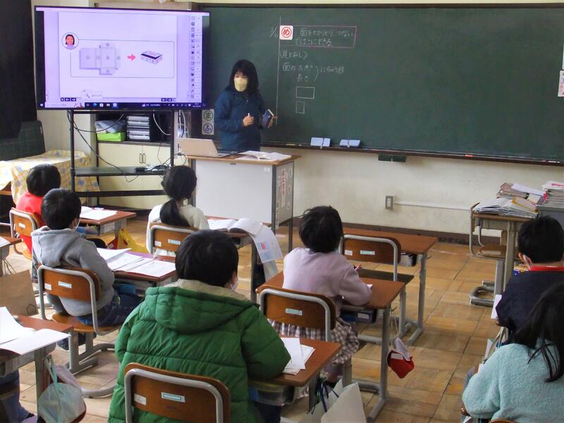算数の授業です。面を切りとり、つないで箱を作っています。