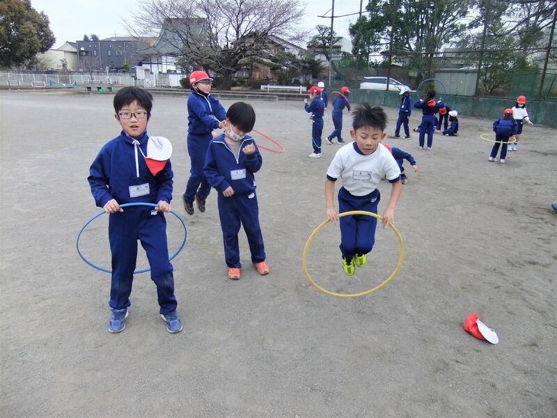 フラフープ跳びに挑戦しています。