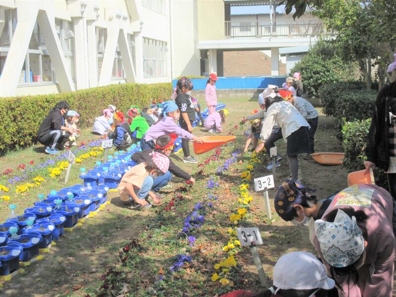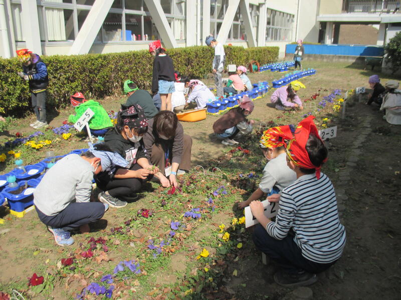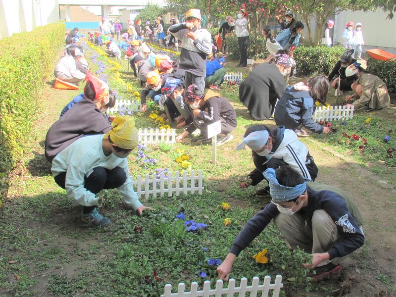 昼休み、児童のボランティアメンバーであるSUNさんサポート隊Jrが、中庭の除草活動を行いました。学年を越えて協力し合い、花壇をきれいにしました。