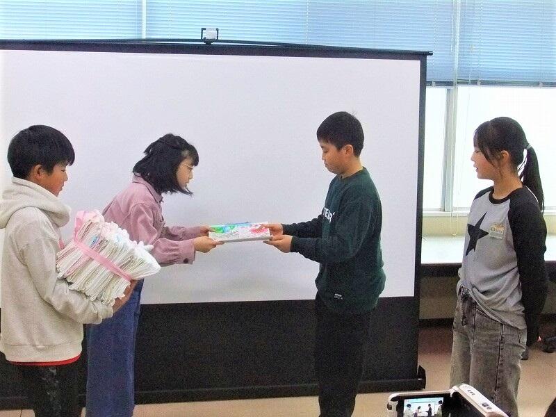 その後、なかよし班ごとに、6年生にプレゼントを贈呈しました。プレゼントを手渡す役目は4年生が担当しましたが、袋の中のプレゼントは、各学年の子どもたちが今日まで手分けして準備してきました。