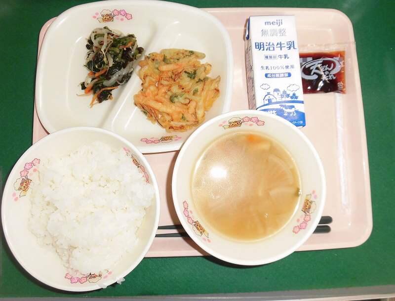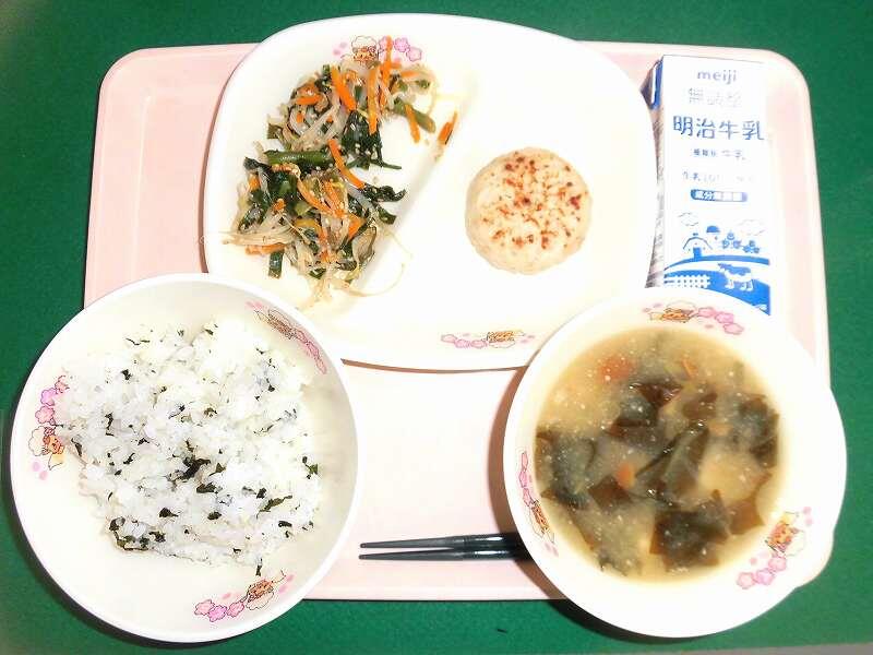 ・ わかめごはん ・ 牛乳 ・ きんぴらバーグ