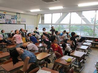 今日のマッスルタイムは、雨のため、各教室でラジオ体操を行いました。校内放送で、ラジオ体操の見本を見ながら、実際に体を動かしました。きびきびと体を動かすことが出来ました。