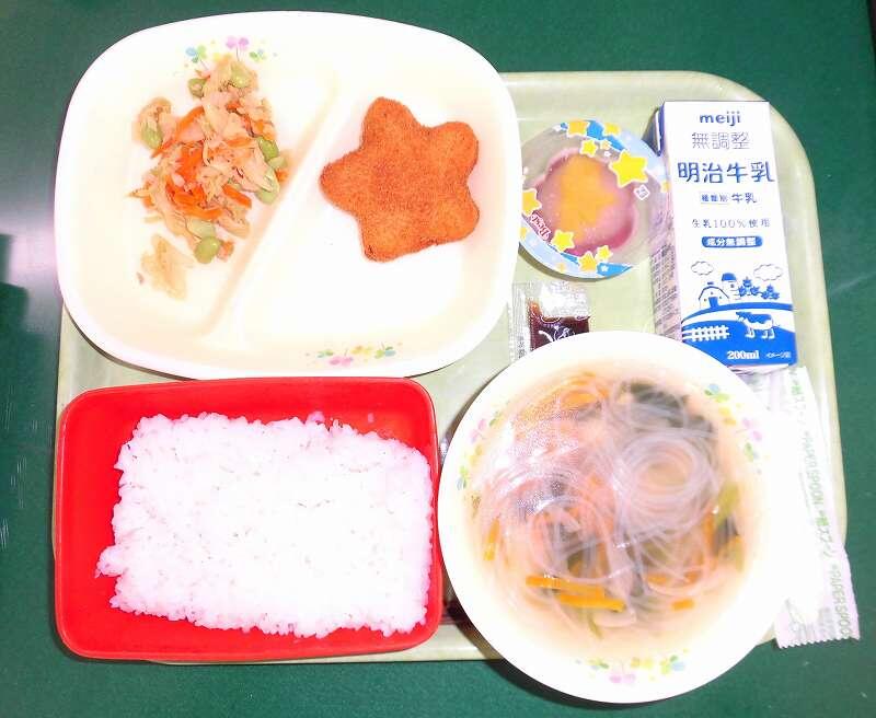 今日は、七夕献立です。天の川をイメージしたスープや星型のコロッケ、七夕ゼリーをつけました。
